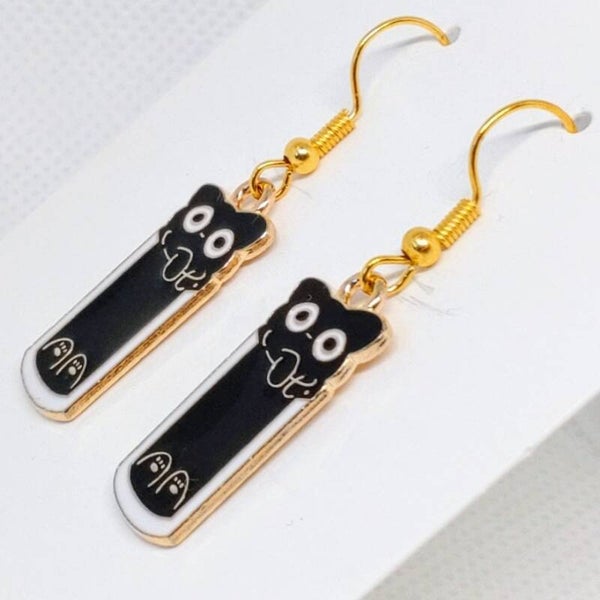 Dangle/drop earrings on gold coloured hypoallergenic hooks with enamel cute black cat stuck in as glass charms.