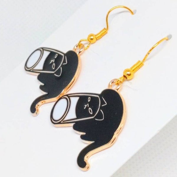 Dangle/drop earrings on gold coloured hypoallergenic hooks with enamel cute black cat head stuck in a glass charms.