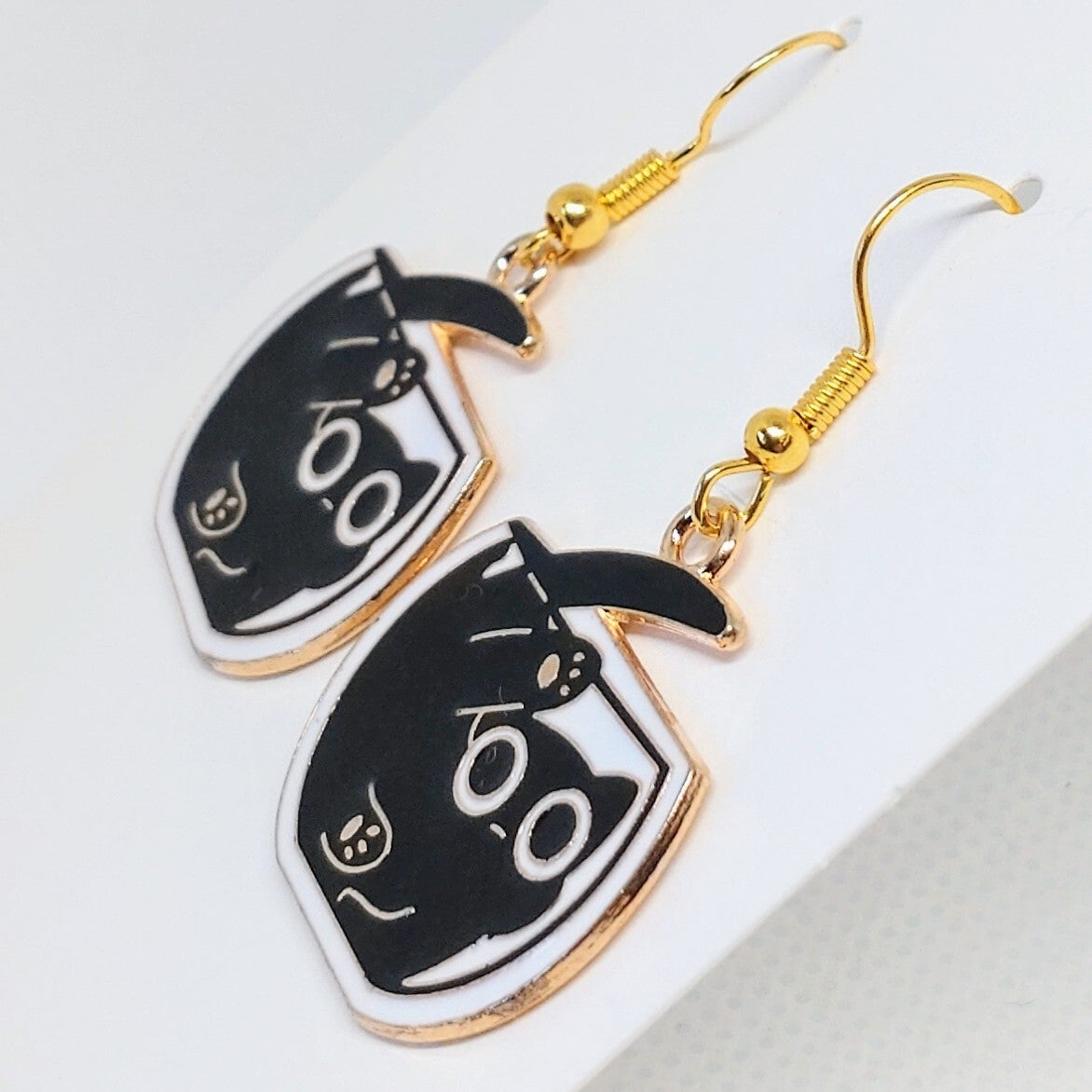 Dangle/drop earrings on gold coloured hypoallergenic hooks with enamel cute black cat lying in a glass bowl charms.